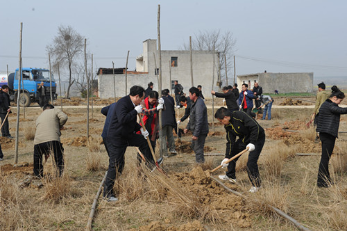 9点30分,汽车驶进北新村。刘传铁厅长与机关干部们一下车,便争相拿起工具,与村民融合在一起,有的挖坑、有的扶苗、有的培土、有的浇水,大家争先恐后,挥镐扬锹,挖坑填土,一刻都没有停留。干部与村民边劳动边交流,不知不觉一个上午过去了,大家齐心种下了1500株栾树,尽管有的人磨破了手套,磨红了手掌,甚至湿透了衣裳,但浓浓情意始终溢于言表。